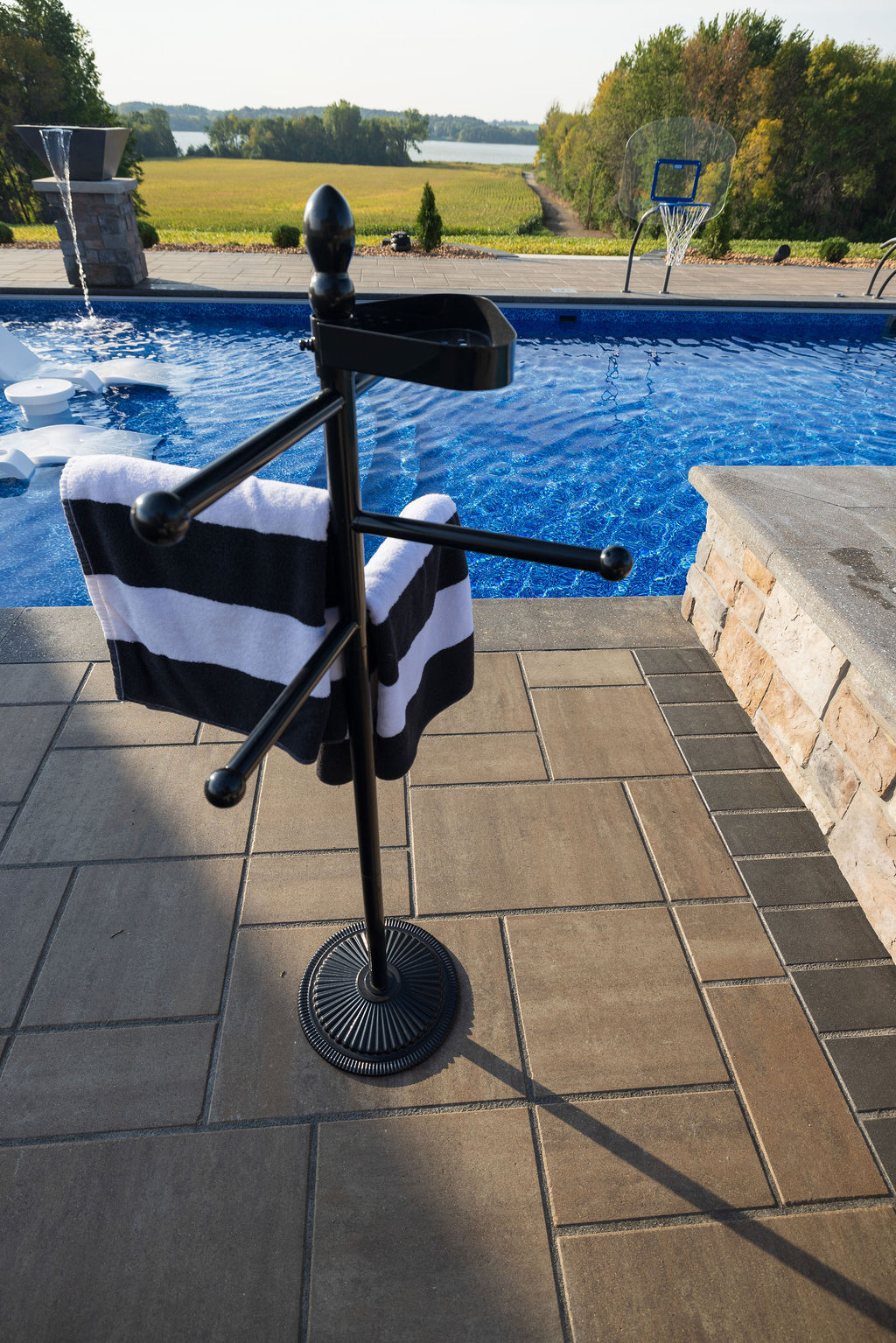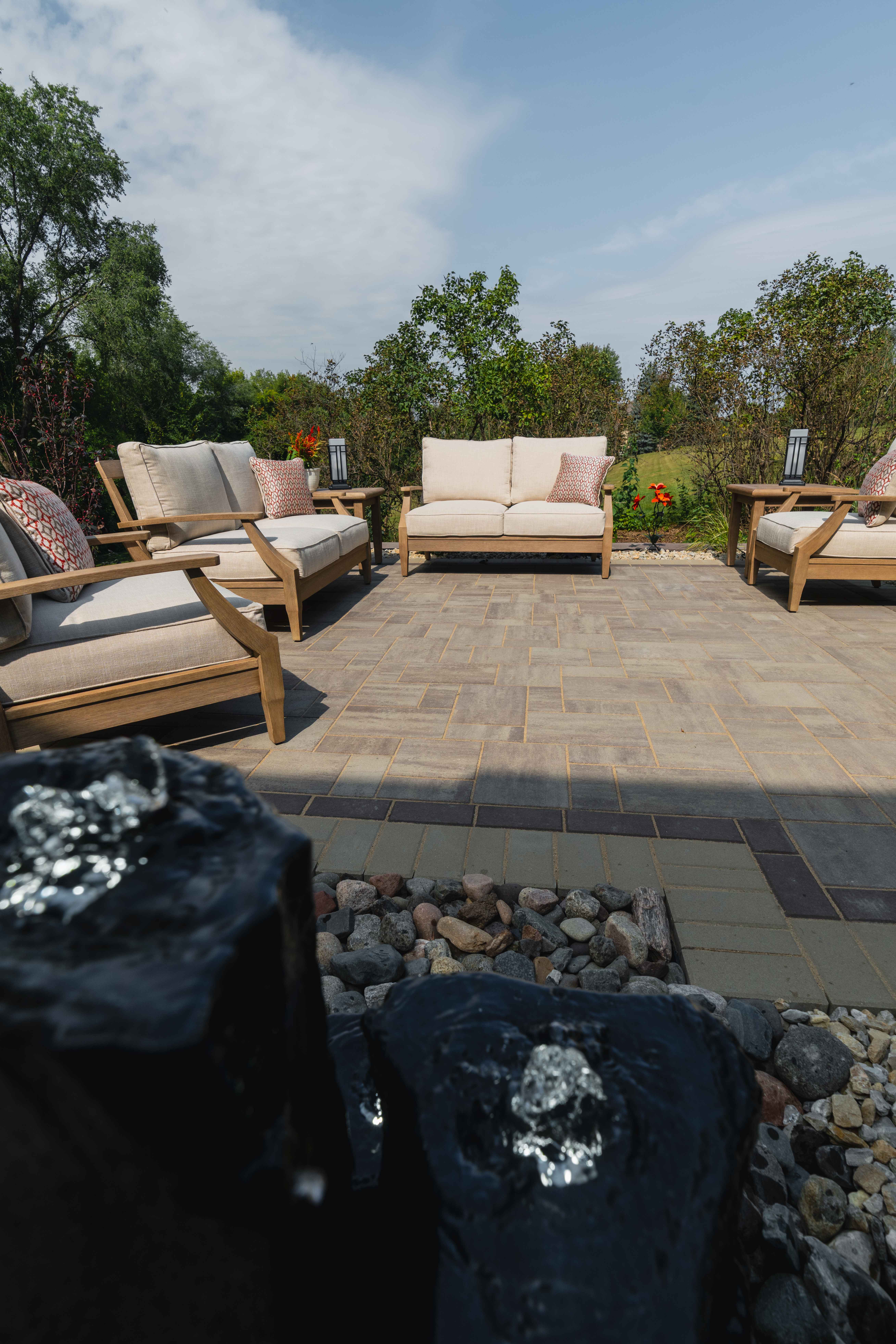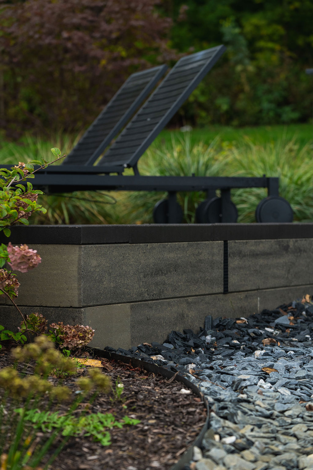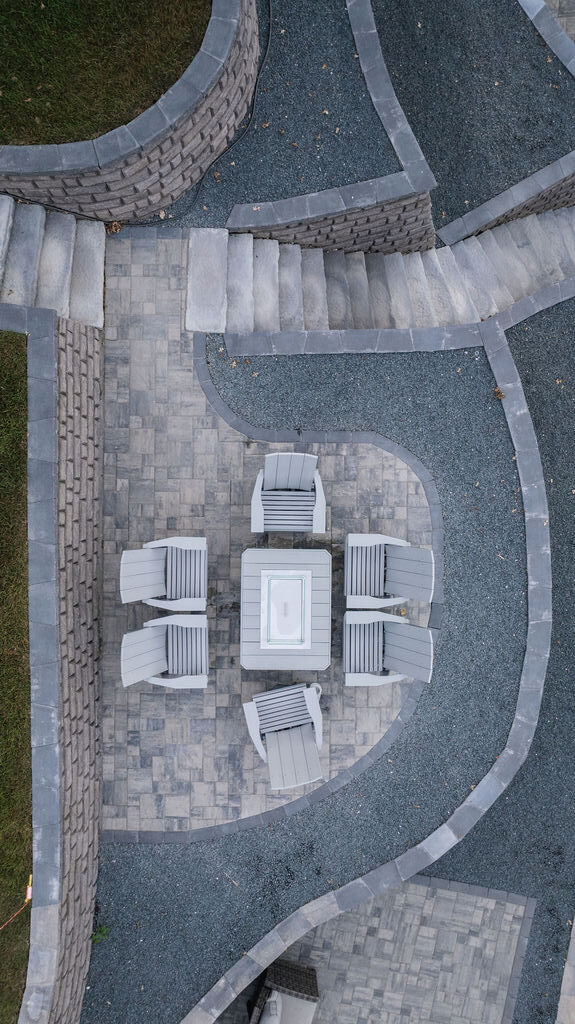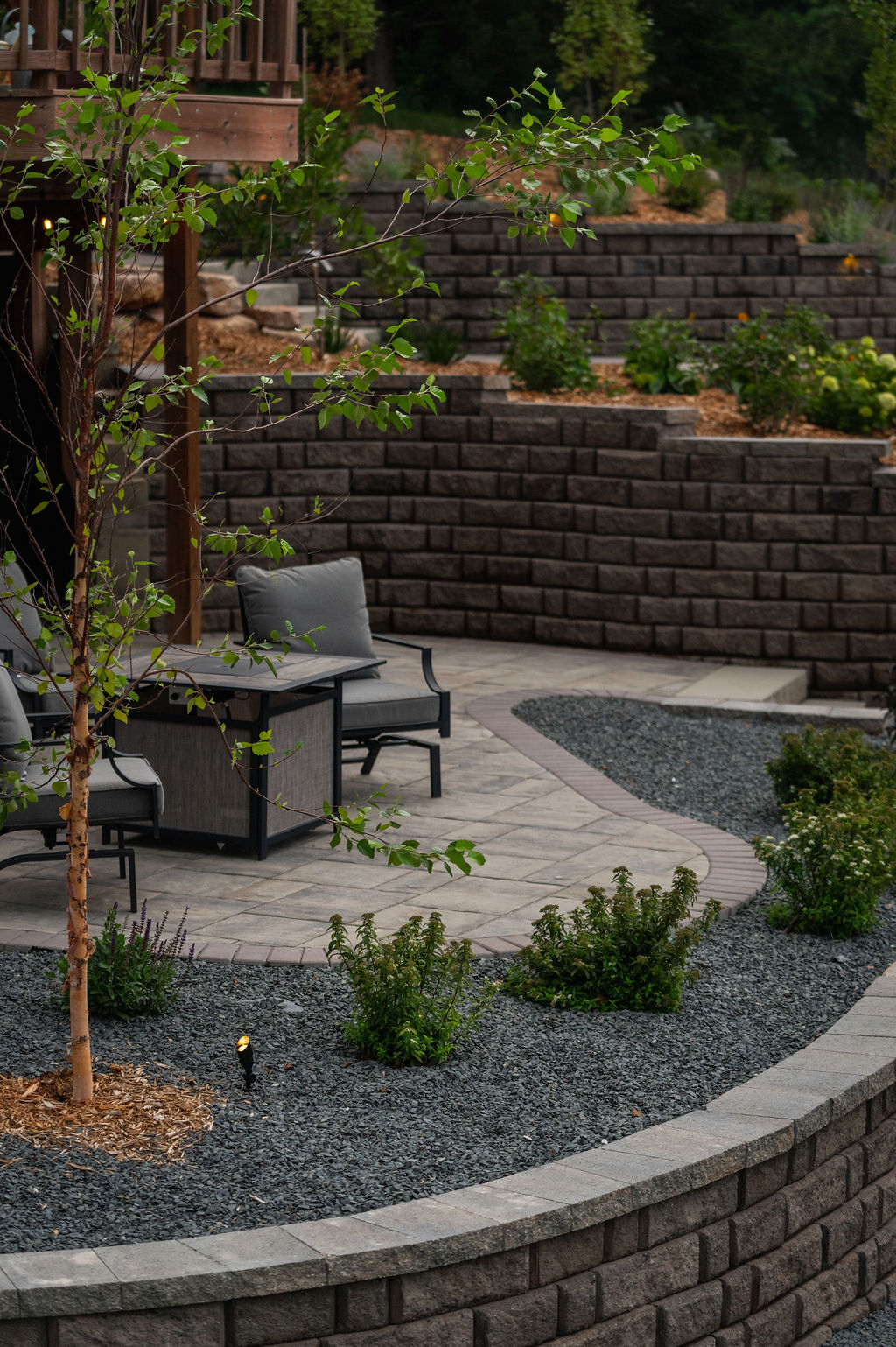 This gem from southern Wisconsin features two of our most popular products from 2025-OUr Titan Paver and our Palisade Wall. The large format and bold colors combine to create a dramatic but serene modern oasis