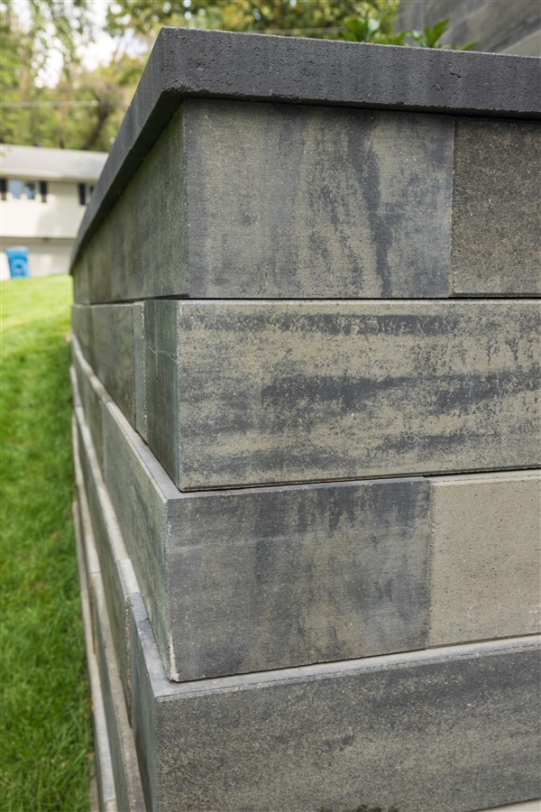 Palisade Wall is the first single-block, facemix retaining wall in the U.S.. An enhancement to both traditional and contemporary landscapes, each block measures 40″ long, 8″ high, and 12″ deep, weighing in at 330 lbs. Available in two refined colors, Café and Cascade, this system features two unit types delivered on separate pallets: Standard Units with facemix on the front and Corner/End Units with facemix on the front and one end.